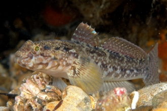 A Montagu's blenny lurking by an underwater patch of barnacles