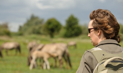 Volunteer counting Konik horse (Equus caballus) Wicken Fen, Cambridgeshire copyright Terry Whittaker/2020VISION