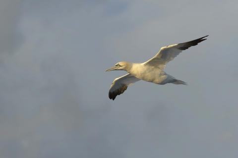 The gannet is easily identified: a big, white bird with black wingtips and a yellow head. It can be spotted circling high above the waves before performing its characteristic fishing dive.