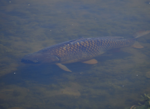 The common carp is a large fish, with a rounded body. It is greyish-bronze in colour and has a single pair of 'barbels' (sensory, whisker-like organs) at its mouth.