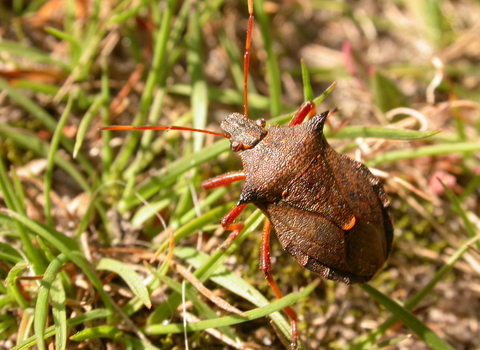 The spiked shieldbug has fearsome shoulder projections or 'spikes' and a predatory nature. This brown bug feeds on caterpillars and other insects in woodlands and on heathlands.