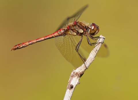 The Common darter is a small, narrow-bodied dragonfly that is typically on the wing from July to October, but can appear as early as May and still be around in December if its mild. This is a very common dragonfly, breeding in all sorts of waterbodies from ponds and ditches, to rivers and lakes. As their name suggests, Common darters dart forward suddenly from a hovering position to catch their insect-prey. They then take their catch to a favoured perch to eat it.How to identify