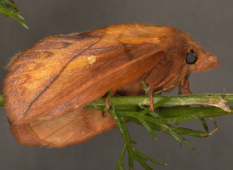This moth is called the drinker because of the caterpillar's habit of drinking drops of dew from grass stems.