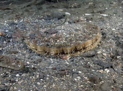 Great scallops are a large bivalve mollusc, its shell familiar to us all with its radiating ridges and characteristic scallop wings by the hinge. The 2 shells are actually different: one is curved like a bowl and the upper shell is flat like a lid. They live in a self-dug hollow on sandy or gravelly seabeds and are filter feeders, filtering out plankton and other micro-organisms. Scallops are a favourite food of starfish, but can actually swim out of harm's way by rapidly opening and shutting their shells, sending out jets of water which propel them over short distances.